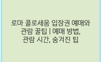 로마 콜로세움 입장권 예매와 관람 꿀팁 | 예매 방법, 관람 시간, 숨겨진 팁 Read More로마 콜로세움 입장권 예매와 관람 꿀팁 | 예매 방법, 관람 시간, 숨겨진 팁 로마를 방문한다면 콜로세움은 반드시 가봐야 할 명소입니다. 입장하기 위해서는 미리 예매하는 것이 좋습니다. 공식 웹사이트에서 티켓을 구매할 …